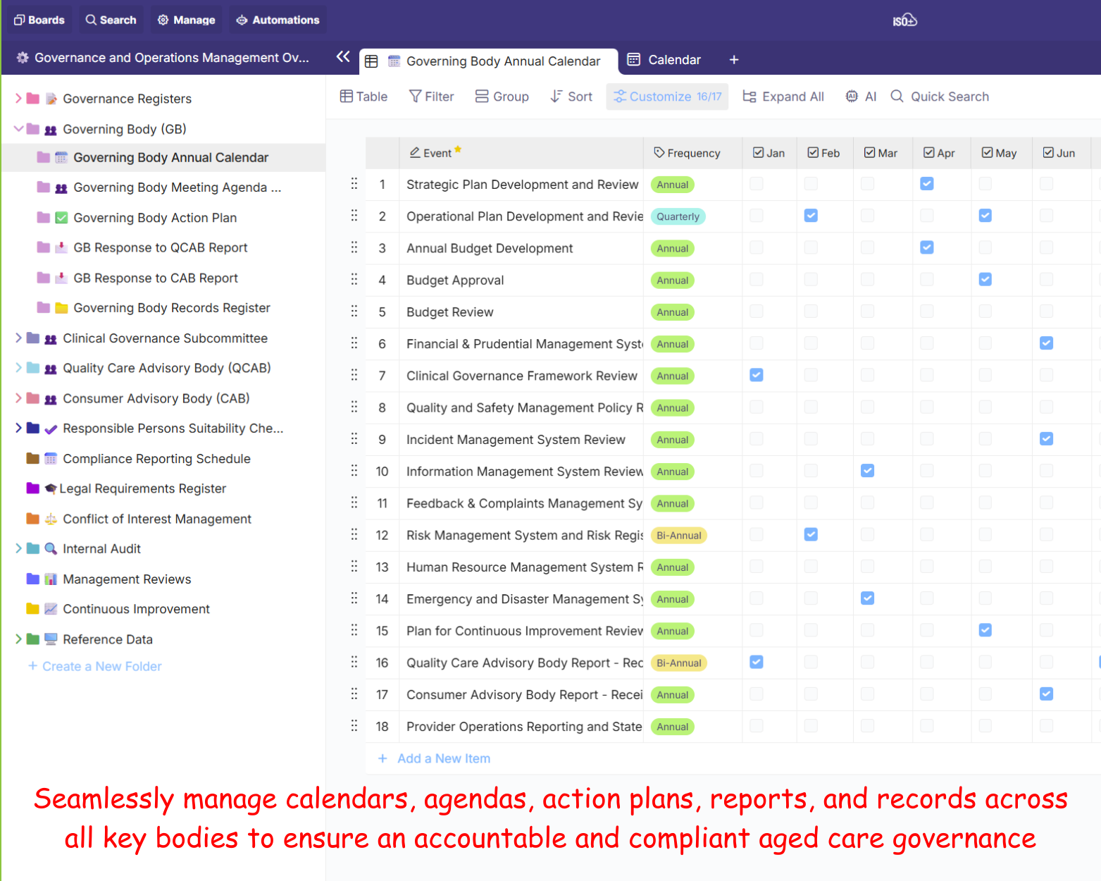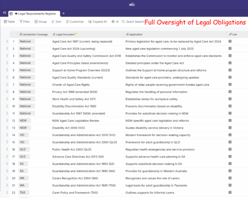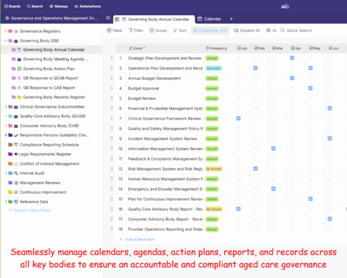 This module supports structured oversight through advisory bodies and ensures compliance via audits, reviews, and reporting. It also helps manage legal obligations, conflicts of interest, and continuous improvement to meet aged care standards.