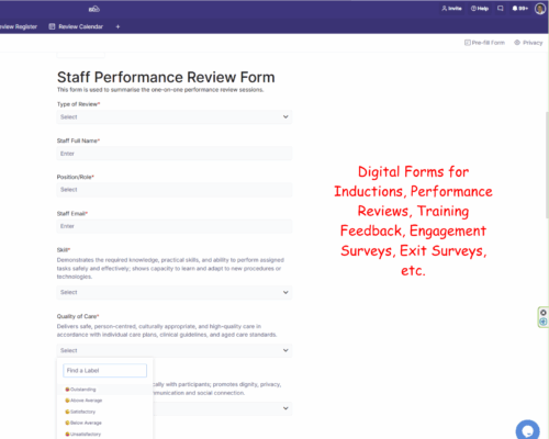This module helps providers manage recruitment and contracts, onboarding and offboarding, inductions, competency and training, leave and payroll, performance reviews, staff surveys, announcements and more.