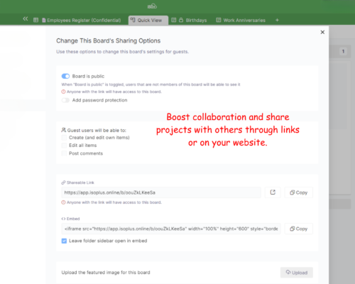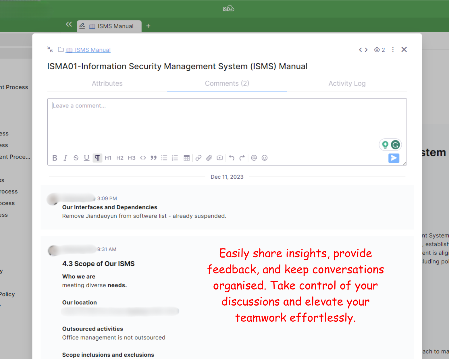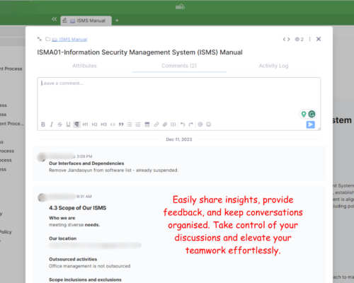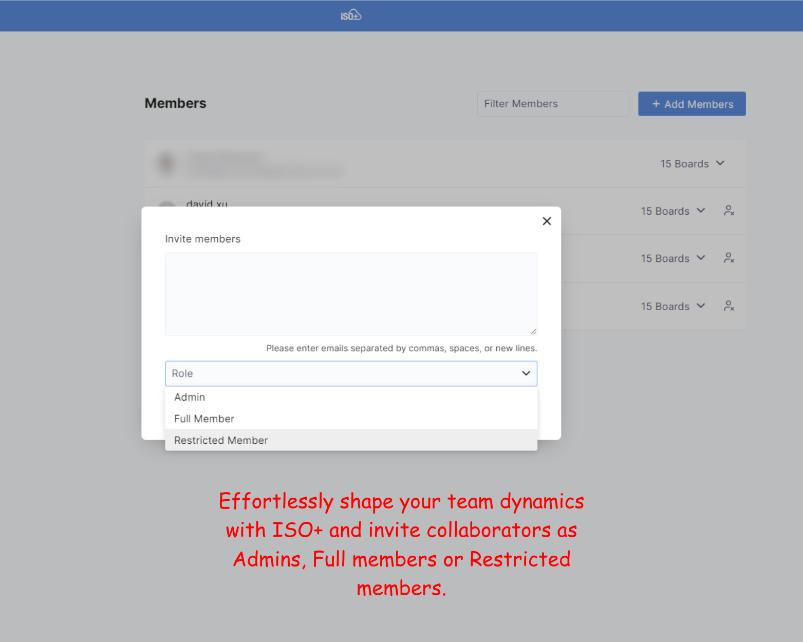 Elevate your experience with ISO+™’s collaborative features, from effortlessly inviting team members to fine-tuning permissions and access levels, tracking comprehensive activity logs, and customising notifications to engaging in insightful comments and managing view privacy and publicly sharing your boards, ISO+™ is designed to keep you seamlessly connected and informed throughout your projects, workflows, and tasks. It goes beyond mere task management; ISO+™ is your gateway to fostering teamwork, ensuring everyone stays in the loop every step of the way.